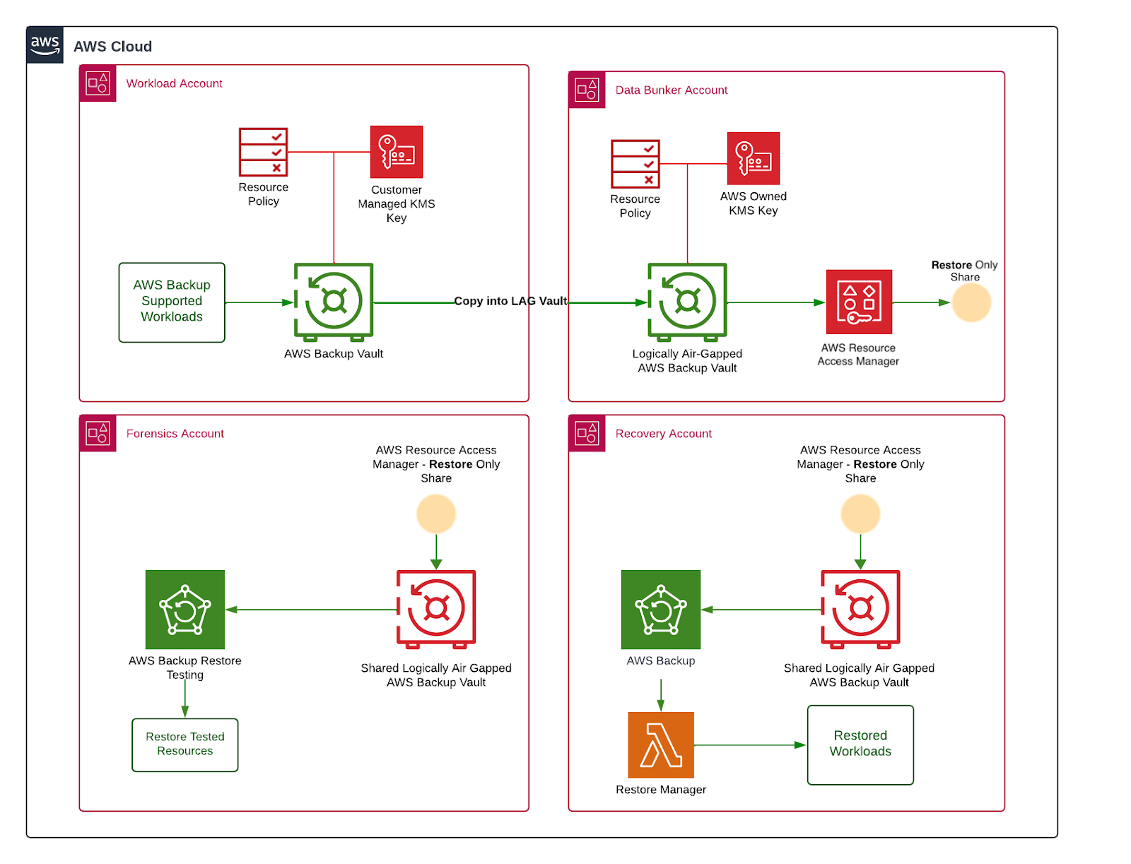 Physical air gaps involve removable or offline storage, while logical air gaps use separate credentials and restricted access. Cloud platforms often enable these through isolated vaults in backup workflows. Many organizations strengthen this setup by creating separate bunker accounts used only for storing backups. These accounts stay isolated from production, and cross-account backup features copy snapshots into them with limited privileges.