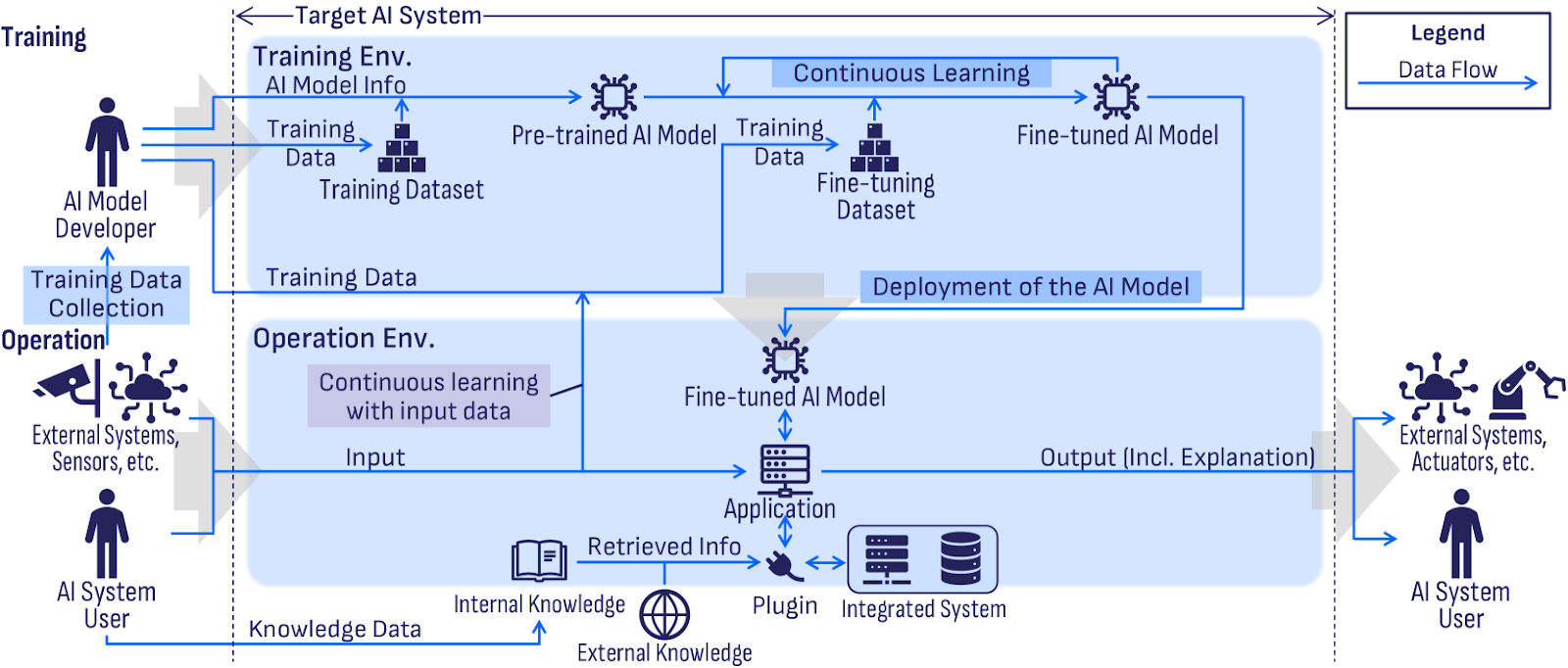 - Operation: Trained models run within applications, taking inputs from sensors, business systems, or users, and delivering outputs to different endpoints. These environments typically use both internal and external data sources, including plugins and retrieval-augmented systems.