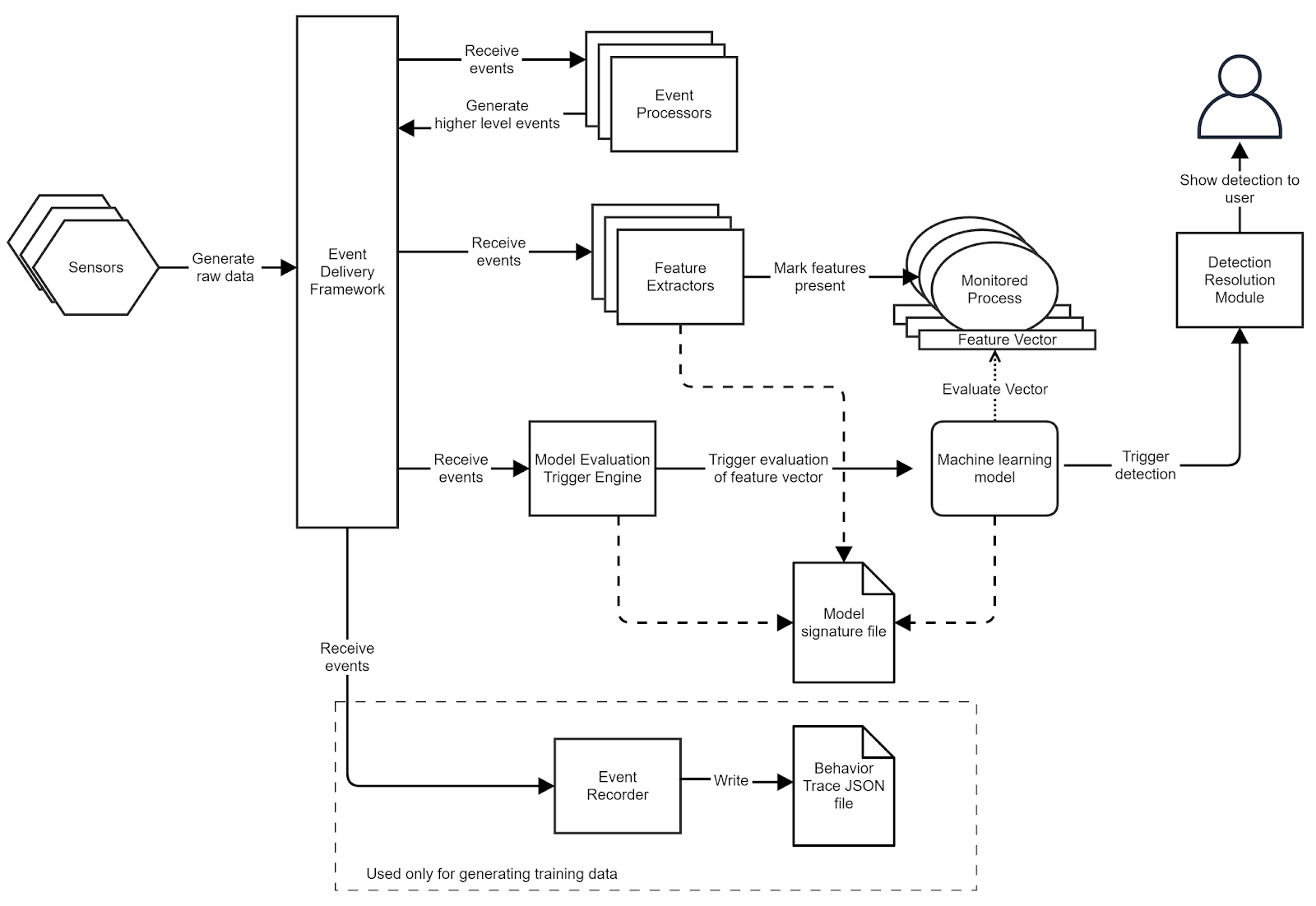 An example of this approach is LEDA (Layered Event-based Malware Detection Architecture). LEDA monitors low-level system events with sensors, processes them through an event layer, and generates feature vectors when specific conditions are met.