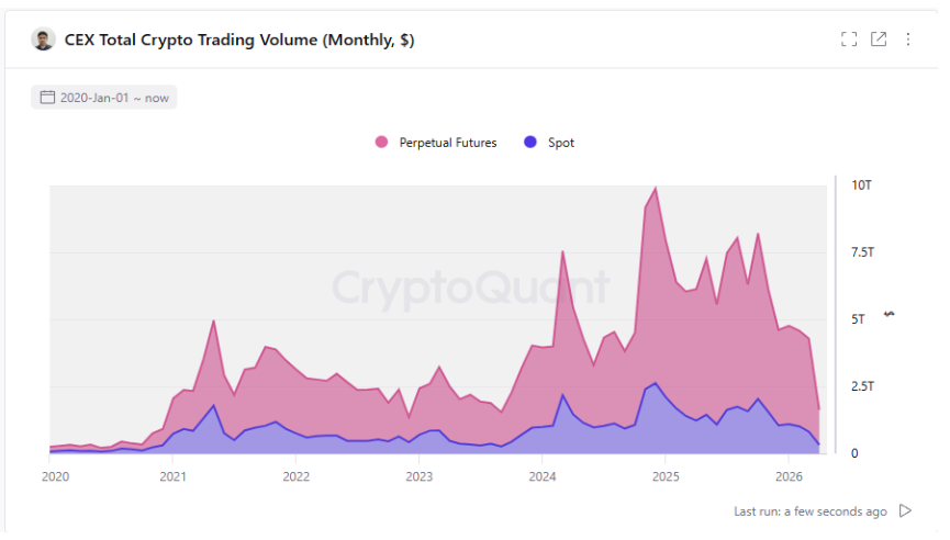 The crypto market went through a severe macro-level contraction during 2026’s Q1. CryptoQuant data highlights that total centralized exchange trading volume fell 48% from its October 2025 peak to $4.3 trillion in March. Instead of the exit of capital, this sharp decline signaled a structural reallocation of risk.