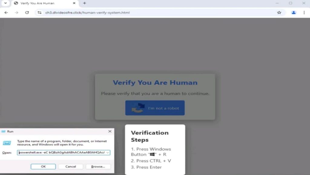 Qualys TRU explained that users are lured to a fake CAPTCHA verification page, often through compromised legitimate software or public-facing applications. Clicking the “I’m not a robot” button triggers a malicious PowerShell command, which downloads an initial stager (malware downloader) onto the target machine. The downloaded payload is a crafted PE file with an obfuscated JavaScript code embedded within it.