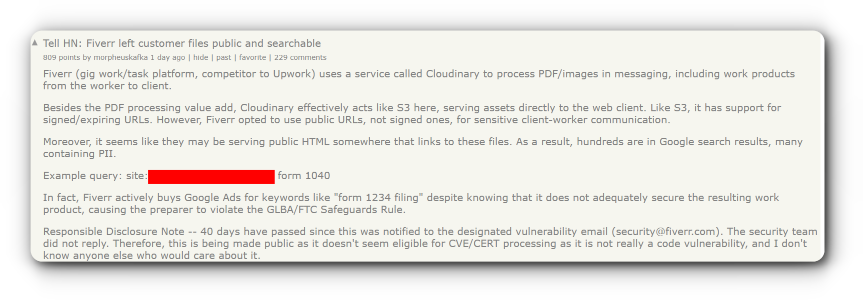 Morpheuskafka first spotted the problem and notified Fiverr’s security team via email around 40 days before making the news public, but the company didn’t reply. Interestingly, it was found that Fiverr even paid for Google Ads for keywords like “form 1040 filing,” even though these specific tax forms were among the files that were not properly secured.