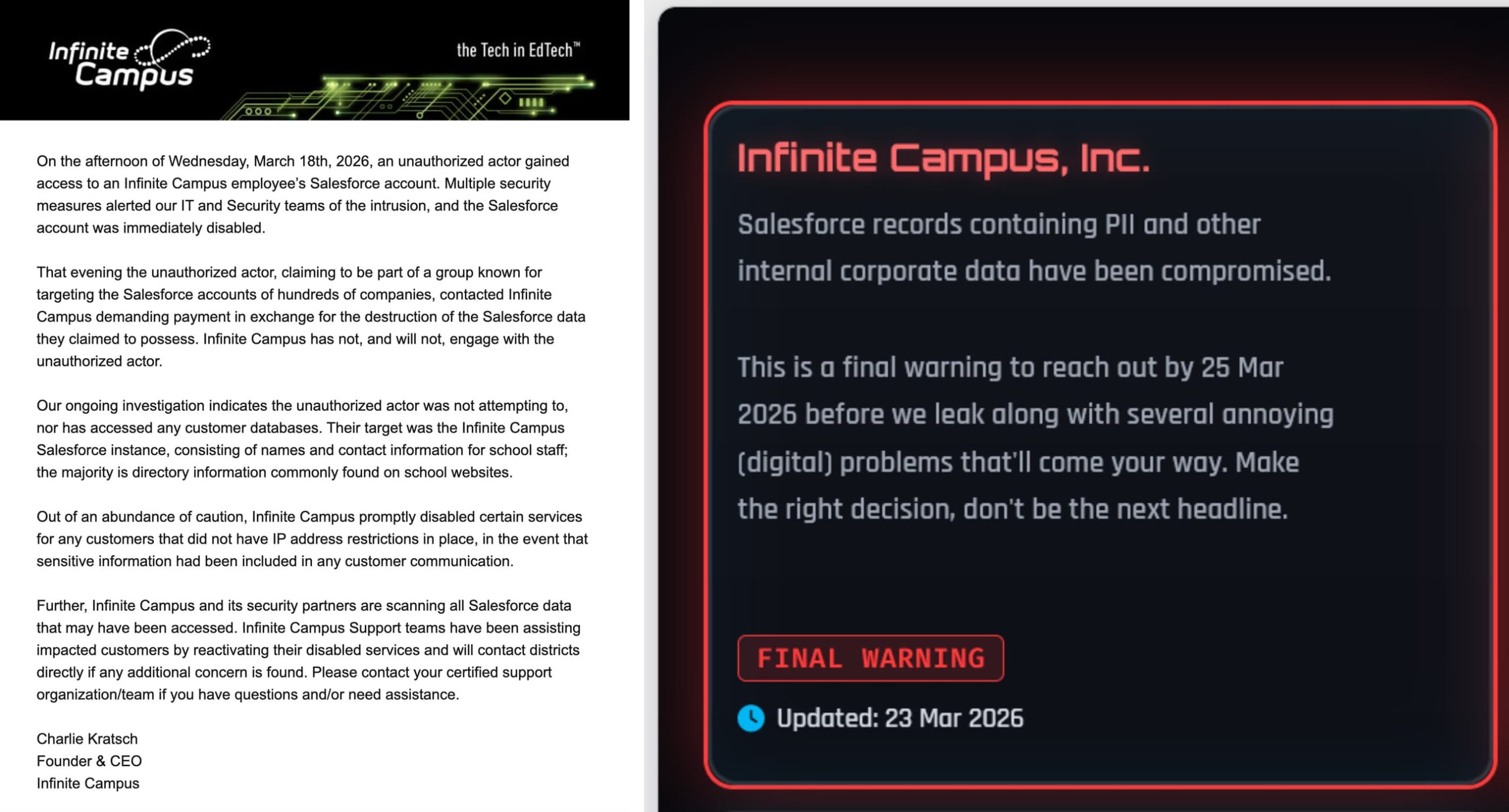 At the same time, education technology provider Infinite Campus is dealing with claims from the ShinyHunters group, which says it exfiltrated data from the company’s systems. Infinite Campus acknowledged unauthorized access but did not disclose the full scale of the breach or whether student records were affected.