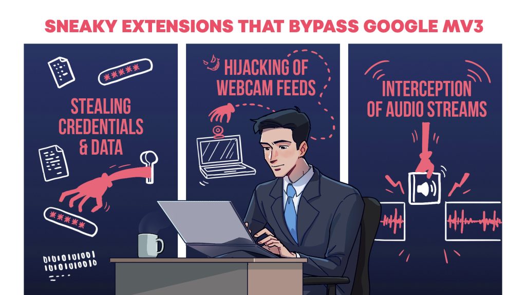 - Extensions can steal live video streams, such as those from Google Meet and Zoom Web, without requiring special permissions.