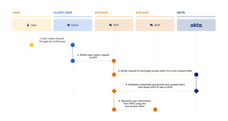 Case Study: In Okta’s On-Behalf-of Token Exchange flow, when an initial request is made, the app receives a user-specific access token. If the app must call another API, it exchanges this token for a new one. The new token includes claims for both the original user and the service, allowing every action to be attributed correctly (Okta Developer, 2023).