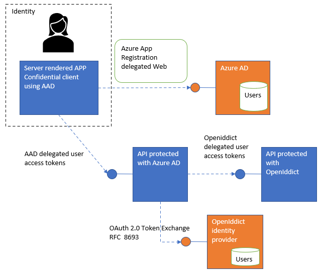 A practical example is a delegated flow between two APIs, one protected by Azure AD and another protected using OpenIddict. The process enables secure delegation and user context continuity between these systems (Damienbod, 2023).