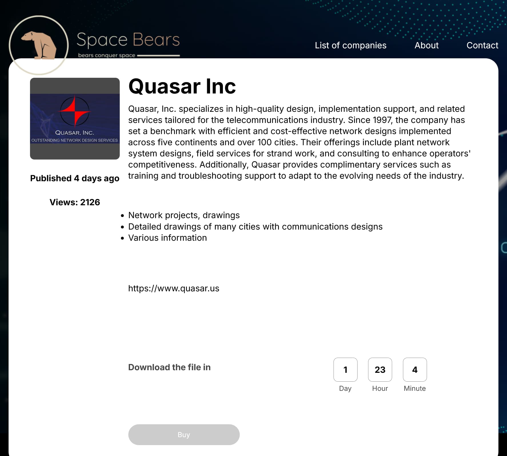 Quasar Inc. appeared on the Space Bears leak site in a separate post dated 4 December 2025. In that entry, Space Bears claims it obtained documents tied to network projects, city drawings, communication layouts and additional internal material. A four-day countdown is active for the Quasar leak as well, with the group also advertising data access for buyers.