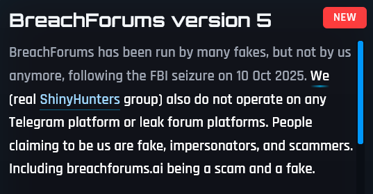 “BreachForums has been run by many fakes, but not by us anymore, following the FBI seizure on 10 Oct 2025. We (the real ShinyHunters group) also do not operate on any Telegram platform or leak forum platforms. People claiming to be us are fake, impersonators, and scammers. Including breachforums.ai being a scam and a fake,” the group said.